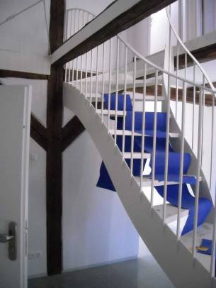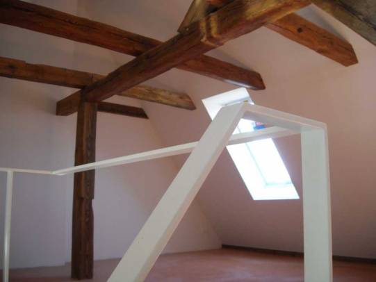 Sichtbare Dachkonstruktion und neue Treppe aus Stahl
